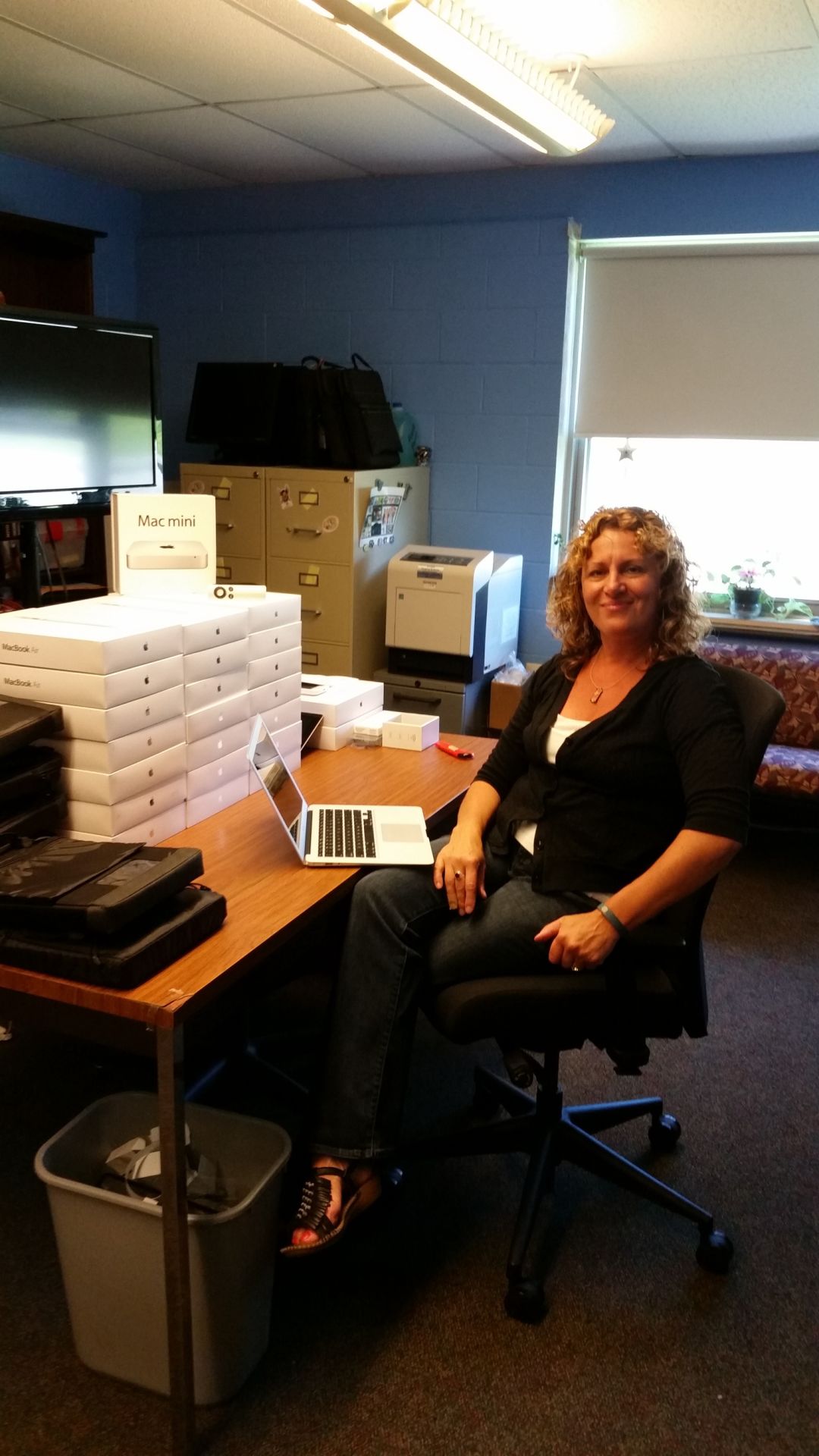 Pam Hecker, Windham High School’s technology specialist, sits in front of a wall of new MacBook Air laptops. More than 1,000 of the new computers will be put to use by teachers, staff and students at the high school this year.