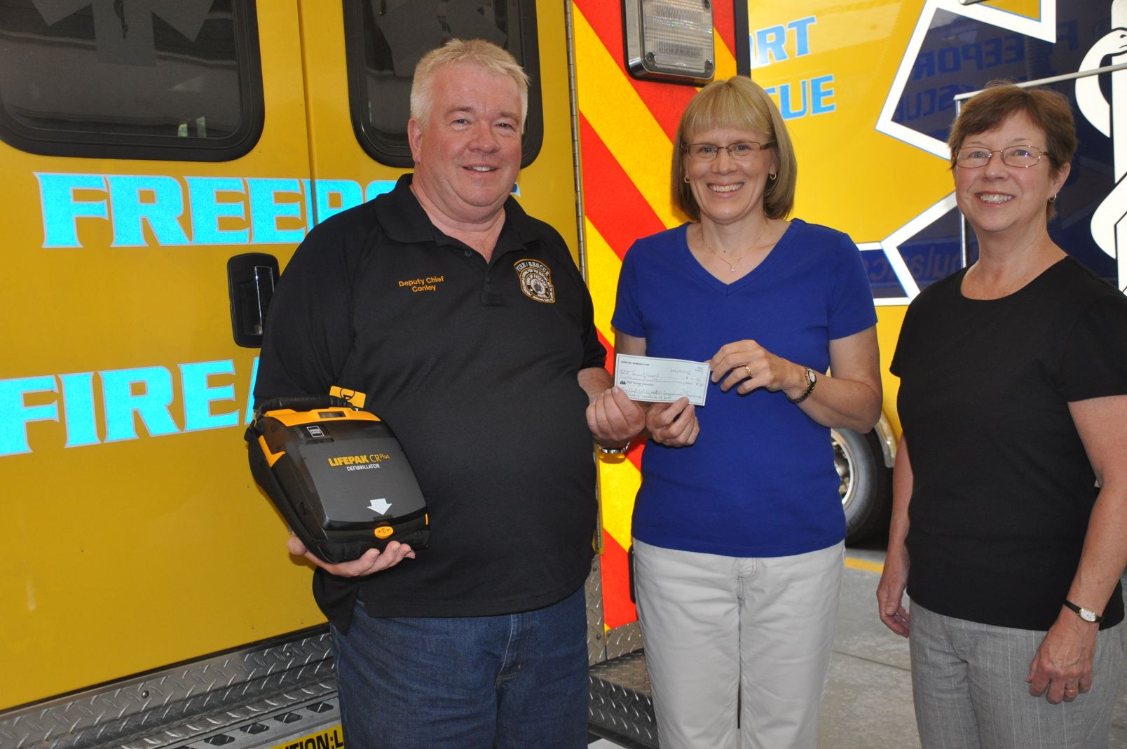 Paul Conley, deputy fire chief in Freeport, holds a defibrillator purchased in part from donations made by the Freeport Woman’s Club. Presenting Conley with a $1,000 check are, from left, club members Mary Hurd and Jan Zimmerman. The club raised the funds at the Spring Bazaar in May.