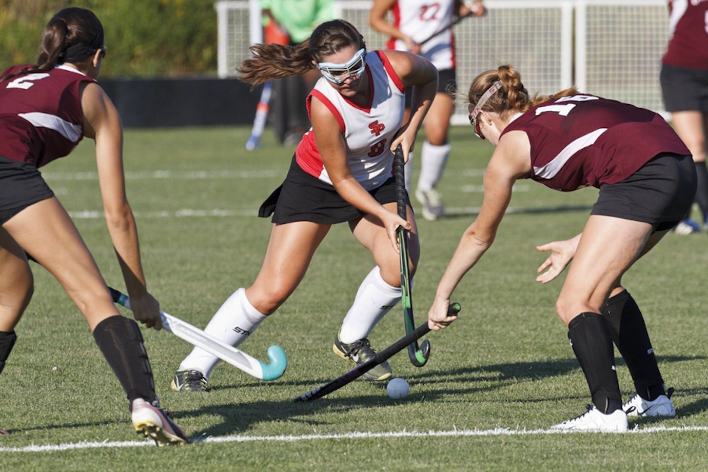 Riot Lydia Henderson looks Gorham middies, Hallie Thomas (2) and Maggie Shields (16), head-on.