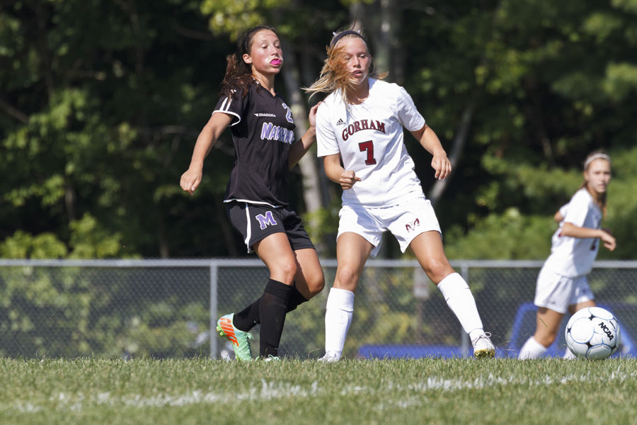 Gorham’s Dana Shaw vies with a Marshwood Hawk for control of the ball.