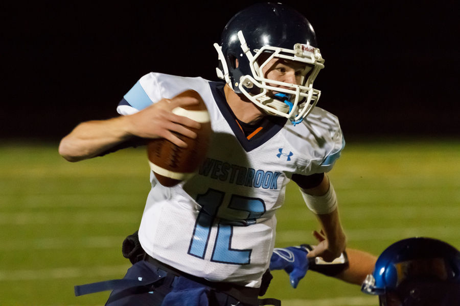 Westbrook QB Bailey Sawyer dodges a Falmouth defender in a scramble outside the pocket to spot an open receiver.