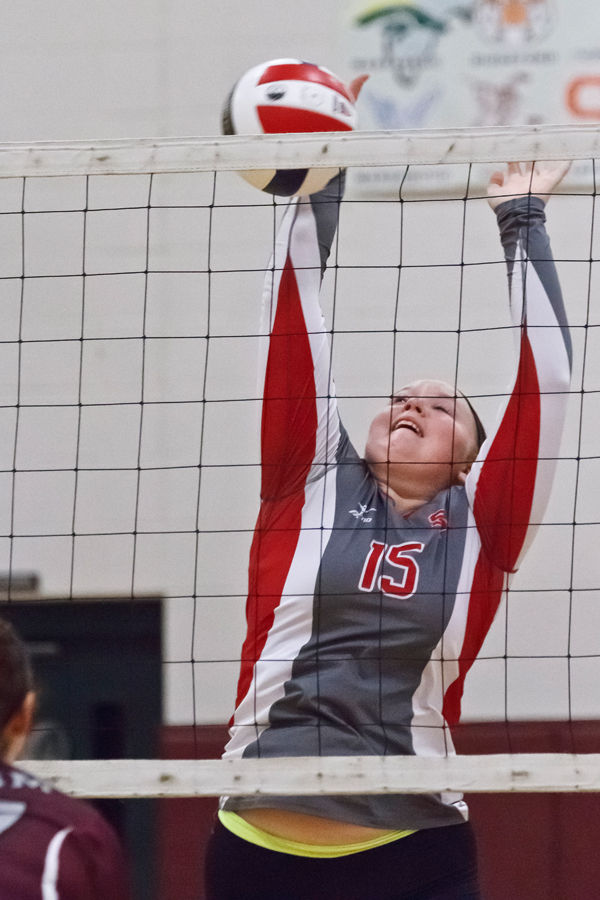 South Portland senior Emily Savage savages the ball at the top of the net.