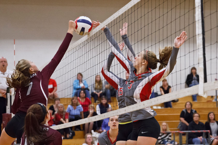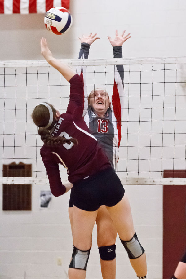 Riots Emily Savage (15) and Holly Black (3) vie over the net with Gorham’s Cassidy Landry.