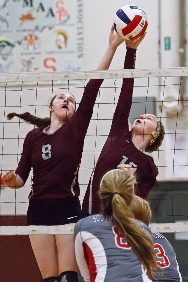 South Portland’s Hailee Owen leaps at the net to block Gorham’s Kristen Curley.