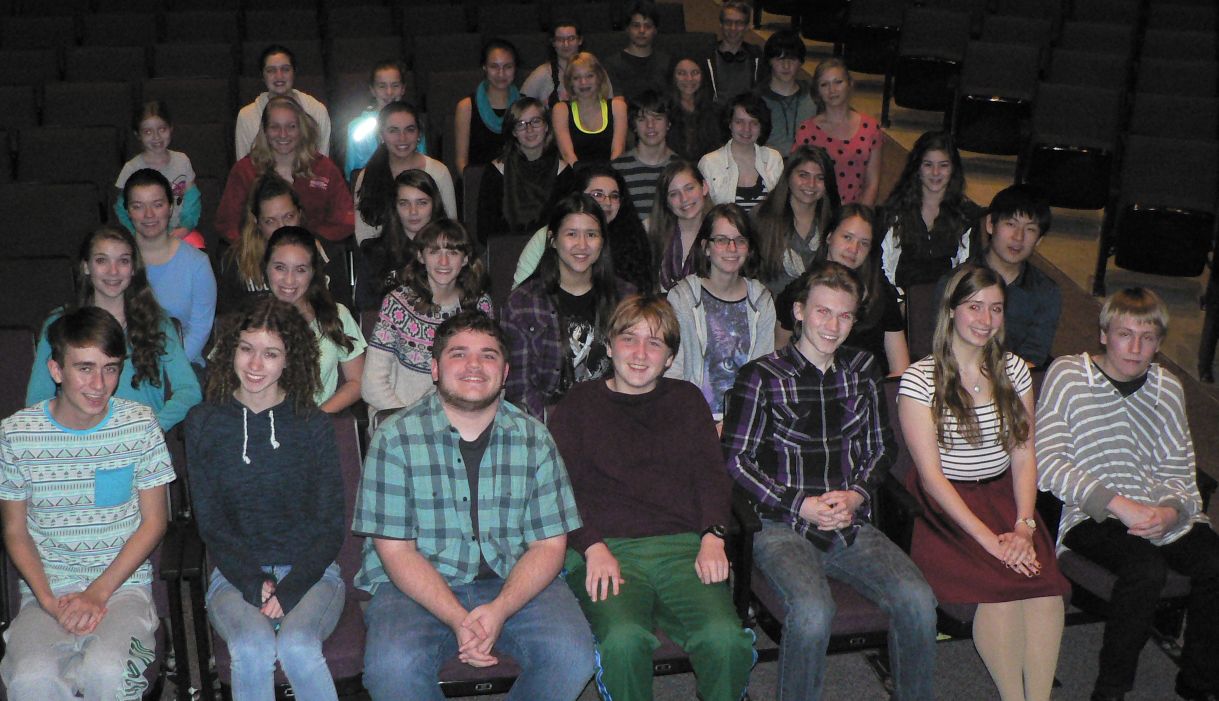 Putting on the musical “Irving Berlin’s White Christmas” calls for a large ensemble. Here the cast of Scarborough High School’s upcoming production takes a break from rehearsing.