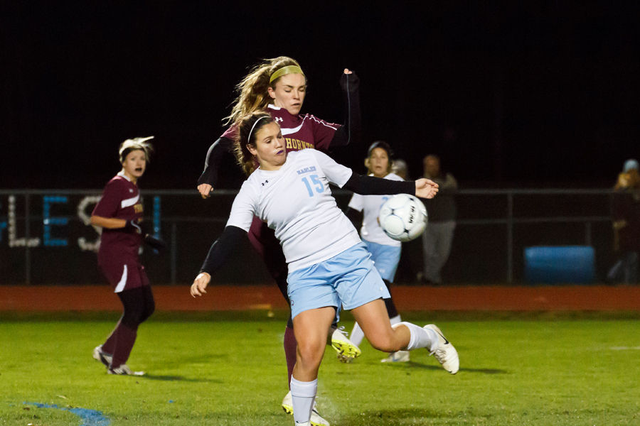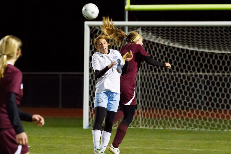 Jenna Soucy vies for a header with a back-to Trojan.