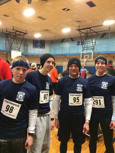 Members of Pownal Fire & Rescue ran in the Portland Thanksgiving Day 4-Miler. Gathered at Portland High School prior to the race, from left, are brothers Jimmy and Joey Minieri, both junior firefighters; their father, Joe Minieri, a firefighter; and Heather Liimakka, an EMT. The boys, who run cross country at Freeport High School, finished in front of their elders.