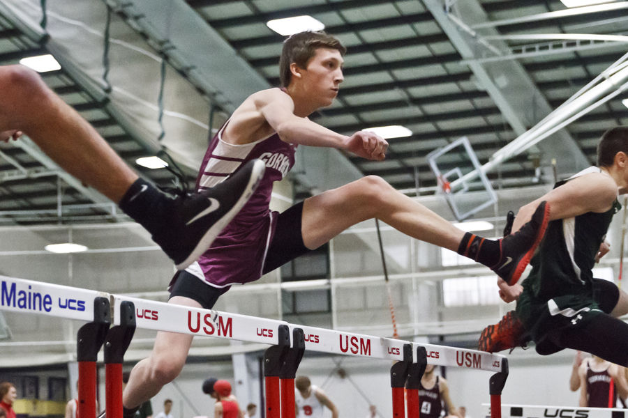 Gorham’s Branden Kuuse leaps in the 55-meter hurdles.