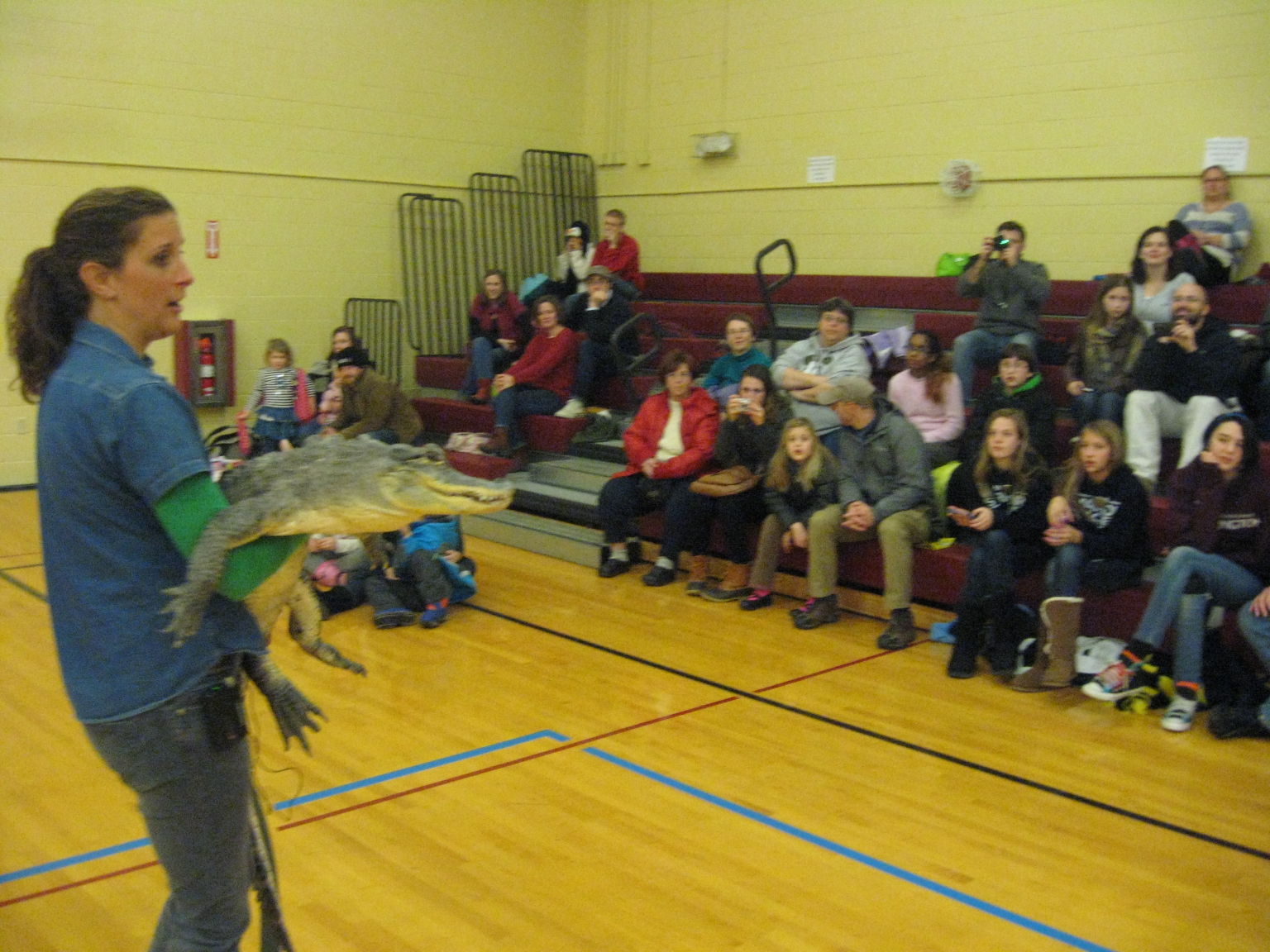 The New Year Gorham celebration even featured an American alligator. Krista Butts of Wildlife Encounters in New Hampshire displays a 7-year-old alligator named Cajun that intrigued a crowd of parents and children in Shaw Gym.