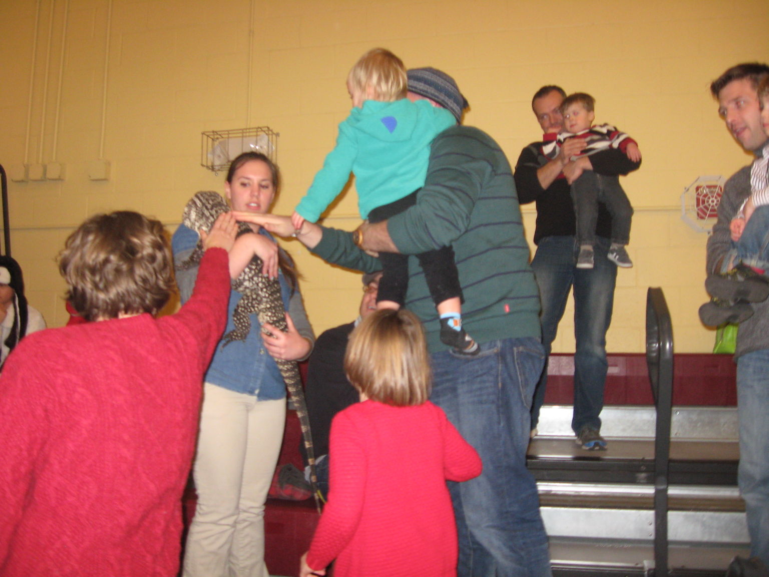 Matt Paul of Gorham holds his 2-year-old son, Jude Paul, who is reaching out to touch a black and white tegu named Monster, a member of the lizard family, displayed by Sarah Cantwell of Wildlife Encounters during the New Year Gorham celebration in Shaw Gym on Dec. 31. Staff photos by Robert Lowell