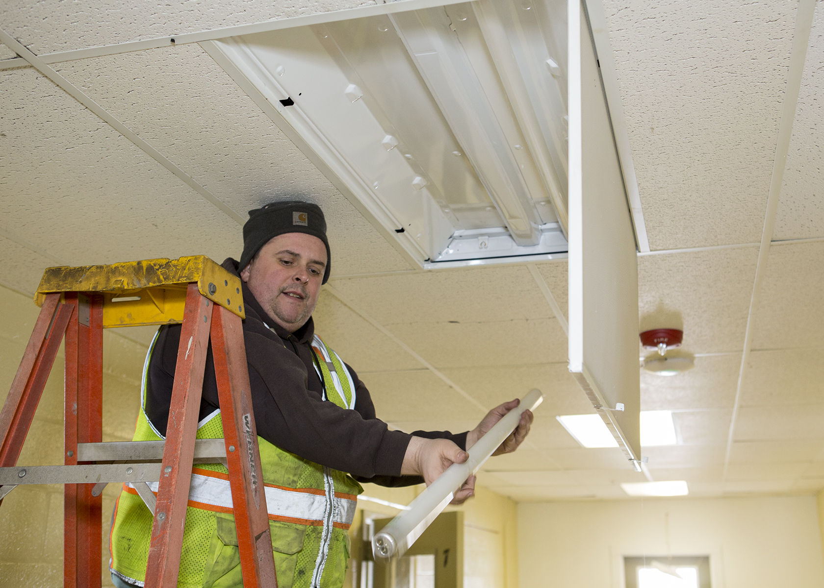 Scott Anastasoff from Gorham’s Public Works Department replaces fluorescent light tubes in the hallway at the Activities Center at Little Falls. The former school has undergone a $500,000 upgrade.Photo by Rich Obrey