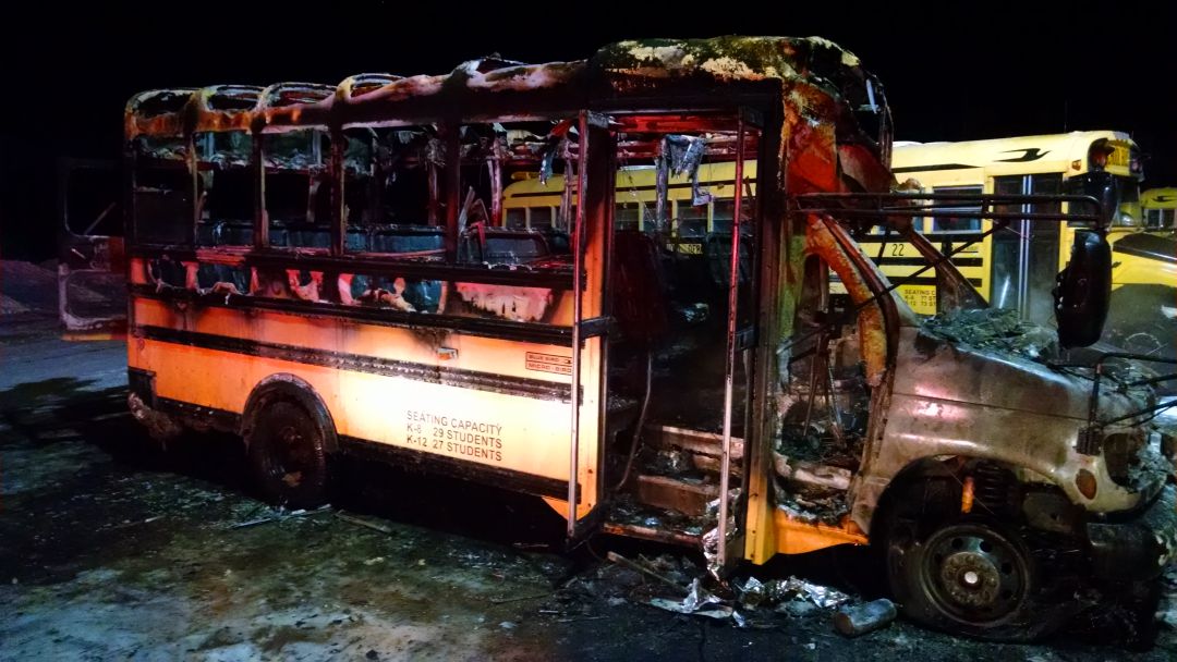 Justice said a full-size bus and another mini bus sustained minor damage, which included charred paint, a few melted plastic components, and a mirror.