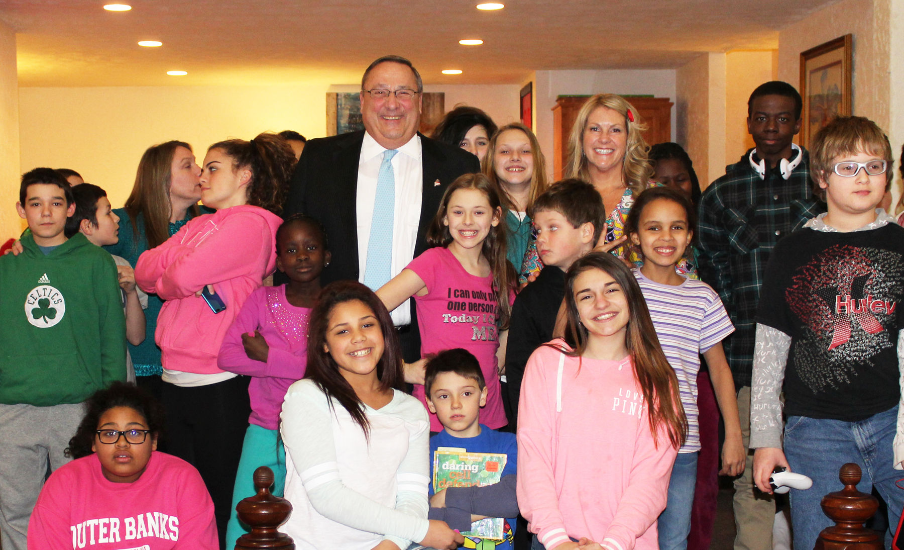 Maine Gov. Paul LePage poses for a photo last week with a group of kids at Westbrook’s My Place Teen Center prior to his budget discussion at the Westbrook Performing Arts Center. Teen center Executive Director Donna Dwyer said of the visit, “One of these kids might be a future Maine governor someday, and now they’ve met a sitting governor who’s not all that different from them,” referring to LePage’s teenage years spent at homeless shelters in Lewiston. Courtesy photo