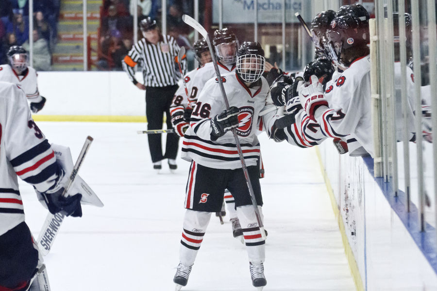 The on-ice Red Storm – including Skylar Pettingill (16) – bump fists with their brothers on the bench after Pettingill’s game-tying goal late in the first period of Saturday’s state championship versus St. Dom’s.