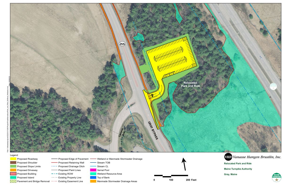 As part of the Maine Turnpike Authority’s forthcoming interchange overhaul, the exit 63 park-and-ride facility, located to the south of the Gray bypass intersection with Route 202, will be moved north, and reconstructed in an expanded form along the east side of the bypass across from the Northbrook Business Park. The new park-and-ride facility will contain about 130 parking spaces, while the existing one has 78 parking spaces.Photo courtesy of the Maine Turnpike Authority