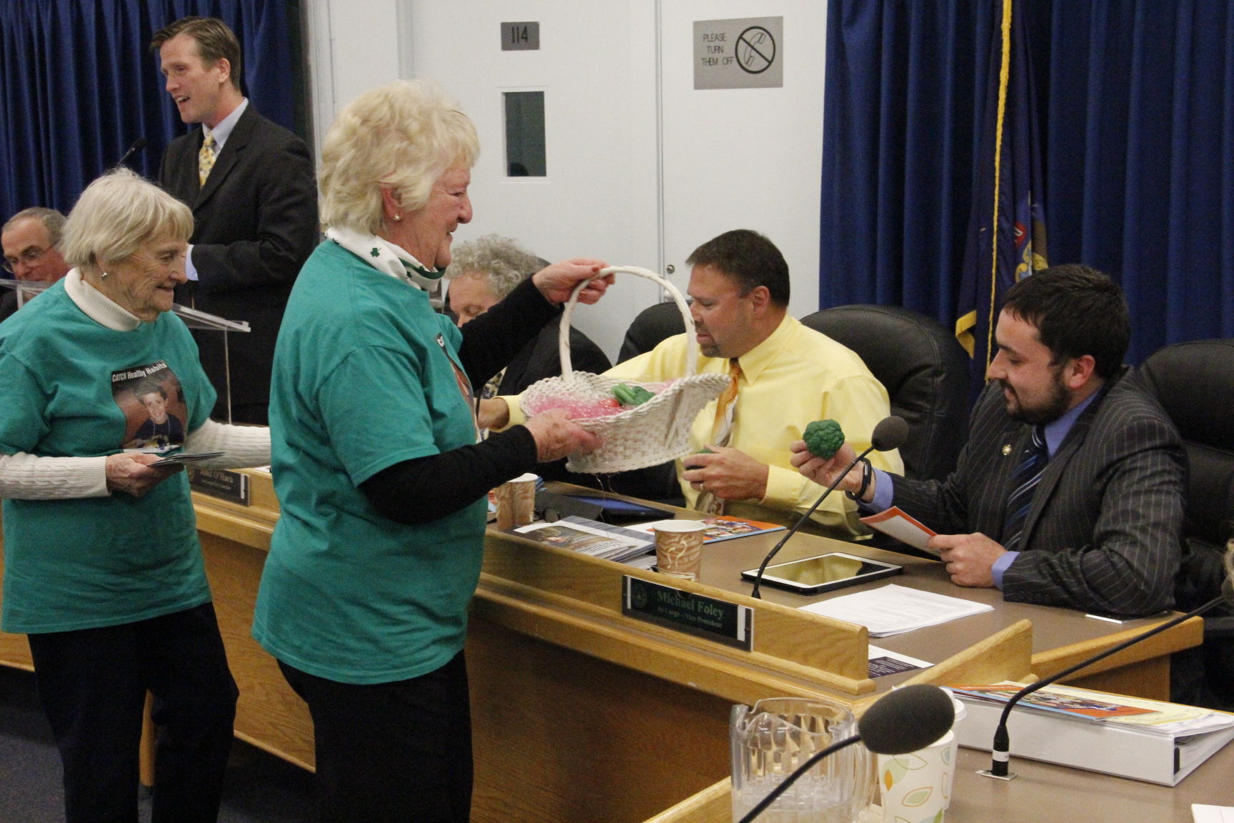 Southern Maine Agency on Aging volunteers, from left, Priscilla Greene and Patricia McDonald hand out information and toy vegetables to Westbrook city coucilors last week. Courtesy photo