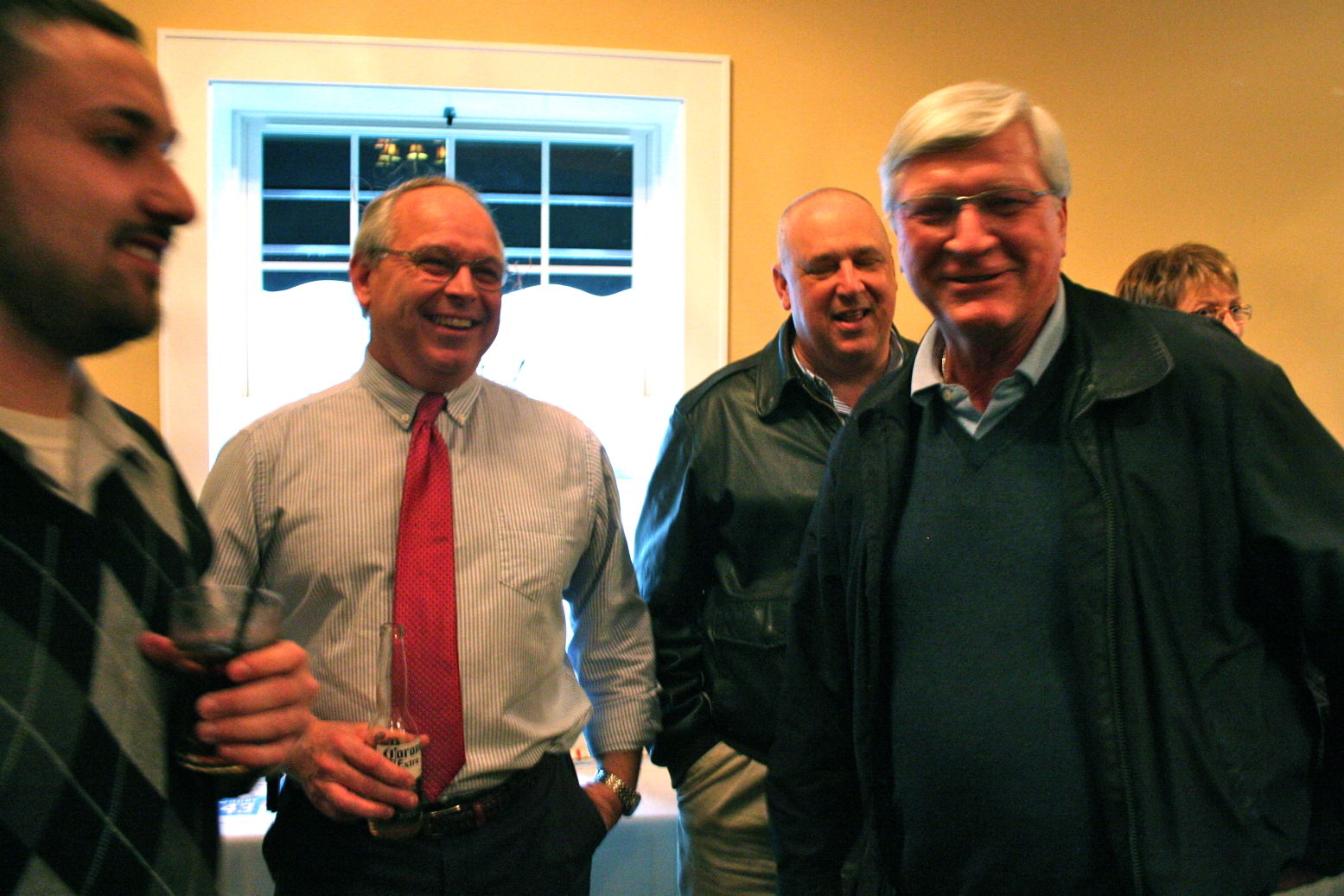 Tom Eldridge, right, the director of Westbrook Public Services reacts to a surprise retirement party held in his honor last Friday at Bruno’s in Portland. From left, City Councilor Mike Foley, City Administrator Jerre Bryant and Superintendent of Schools Marc Gousse congratulate Eldridge after 43 years in Westbrook. Staff photo by Andrew Rice
