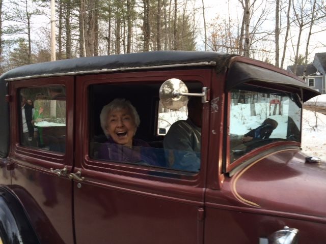 Elizabeth “Betty” Edwards, of Standish, rides in a Model T Ford en route to her second of five 100th birthday parties earlier this month. Edwards has been engaged in a variety of civic enterprises in town since she moved to Standish in 1976. Photo courtesy of Kendra Drinkwater