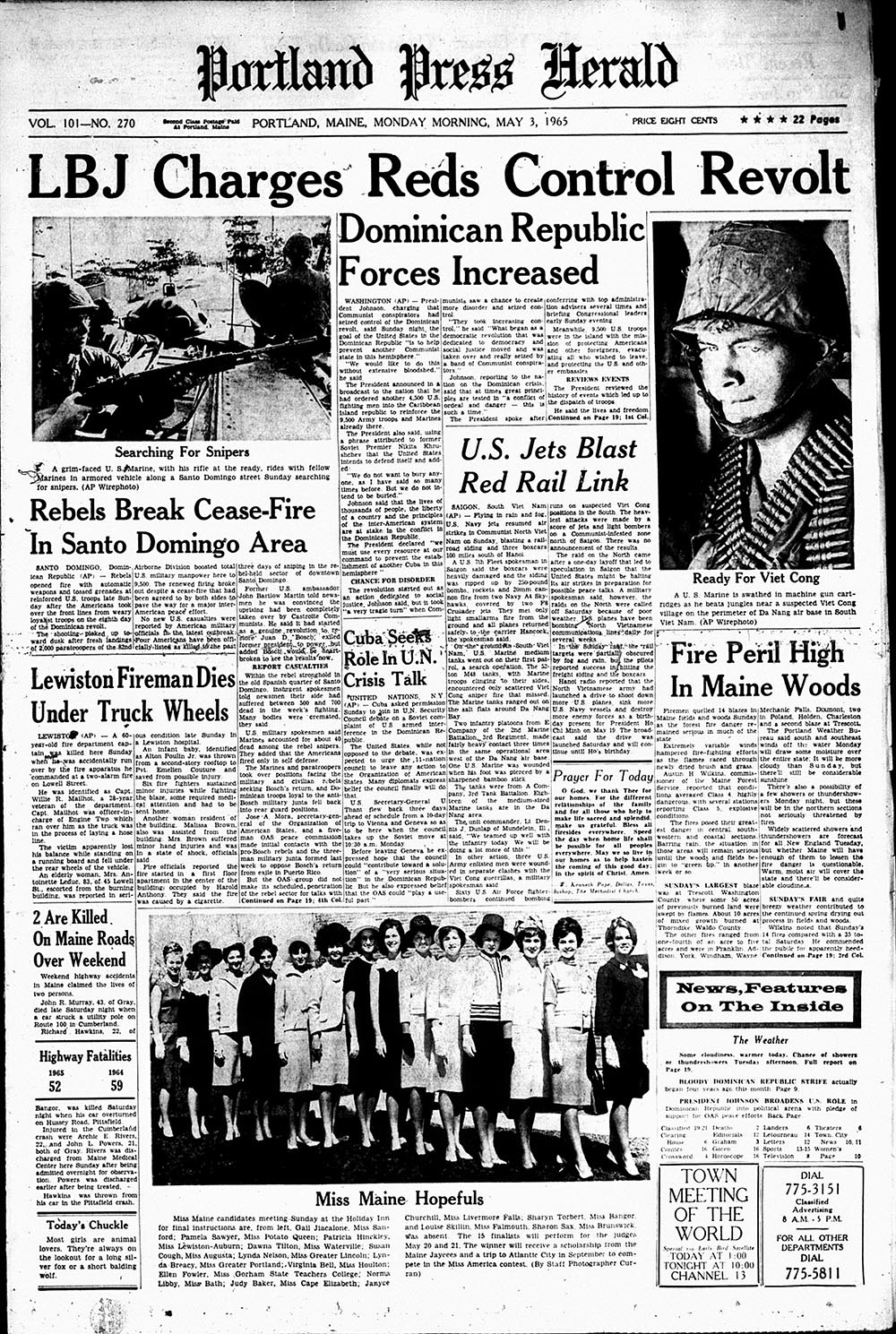 View the historic front page from the Portland Press Herald: Lewiston fireman run over by truck; U.S. jets blast Red rail link; Miss Maine hopefuls, suited and hatted.