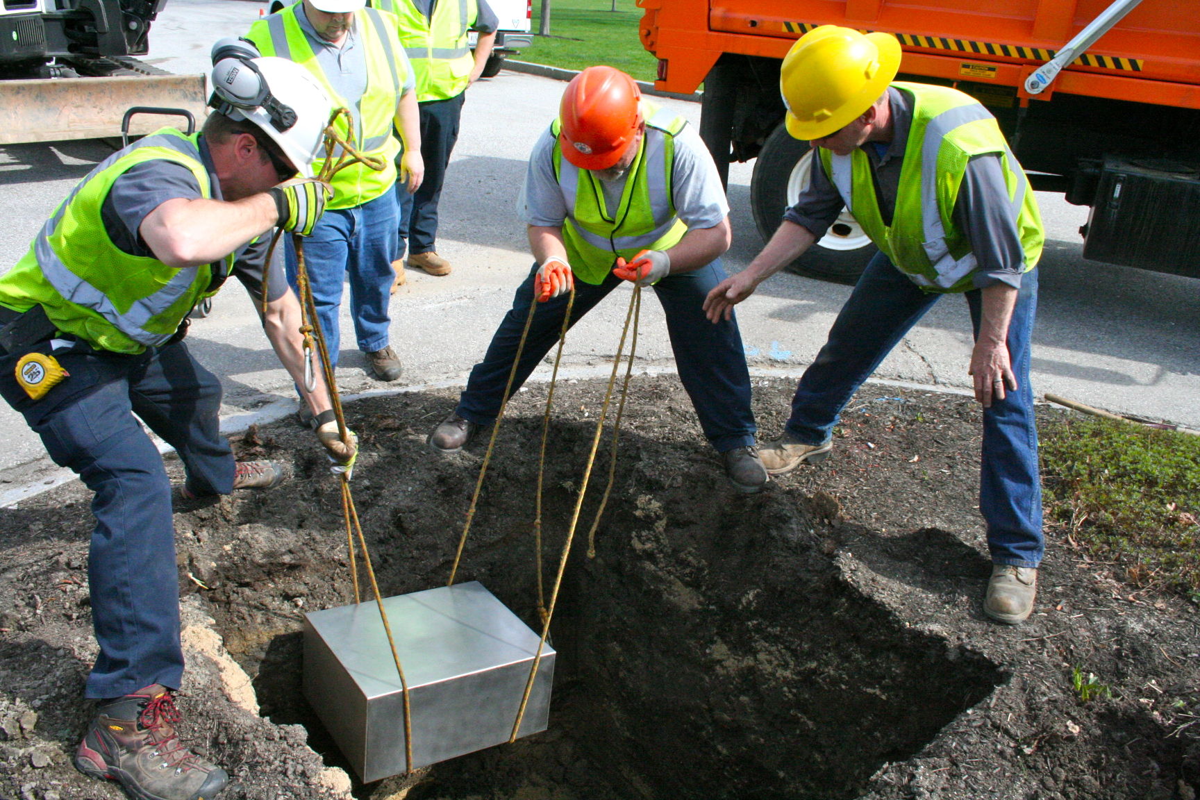 Westbrook Public Services employees Doug Eaton, left, and Dan Wight lower the estimated 80-pound bicentennial time capsule into the ground in Riverbank Park Tuesday. Fred Roberts, right, also assisted. The hole was then filled with sand, with a Sonotube filled with concrete covering the capsule, and serving as the base for a granite monument. Arty Ledoux, the deputy director of Public Services, said the monument will be installed in time for Westbrook Together Days. The time capsule will remain buried until 2114. Staff photo by Andrew Rice