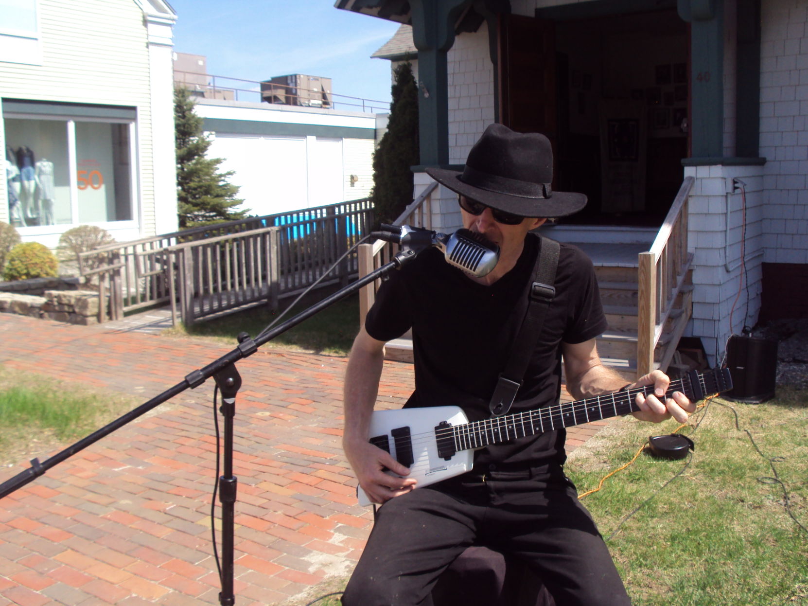 David Ames of Freeport plays the Rolling Stones song “Angie” on the lawn of the First Parish Church Congregational in Freeport last Thursday. Ames was collecting money in a jar he placed beside him.Staff photo by Larry Grard