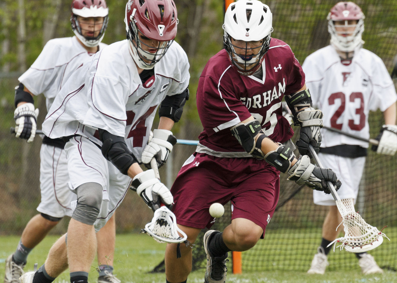 Freeport’s Reid Poissonier carries forward for the Falcons against Gorham on Saturday morning.