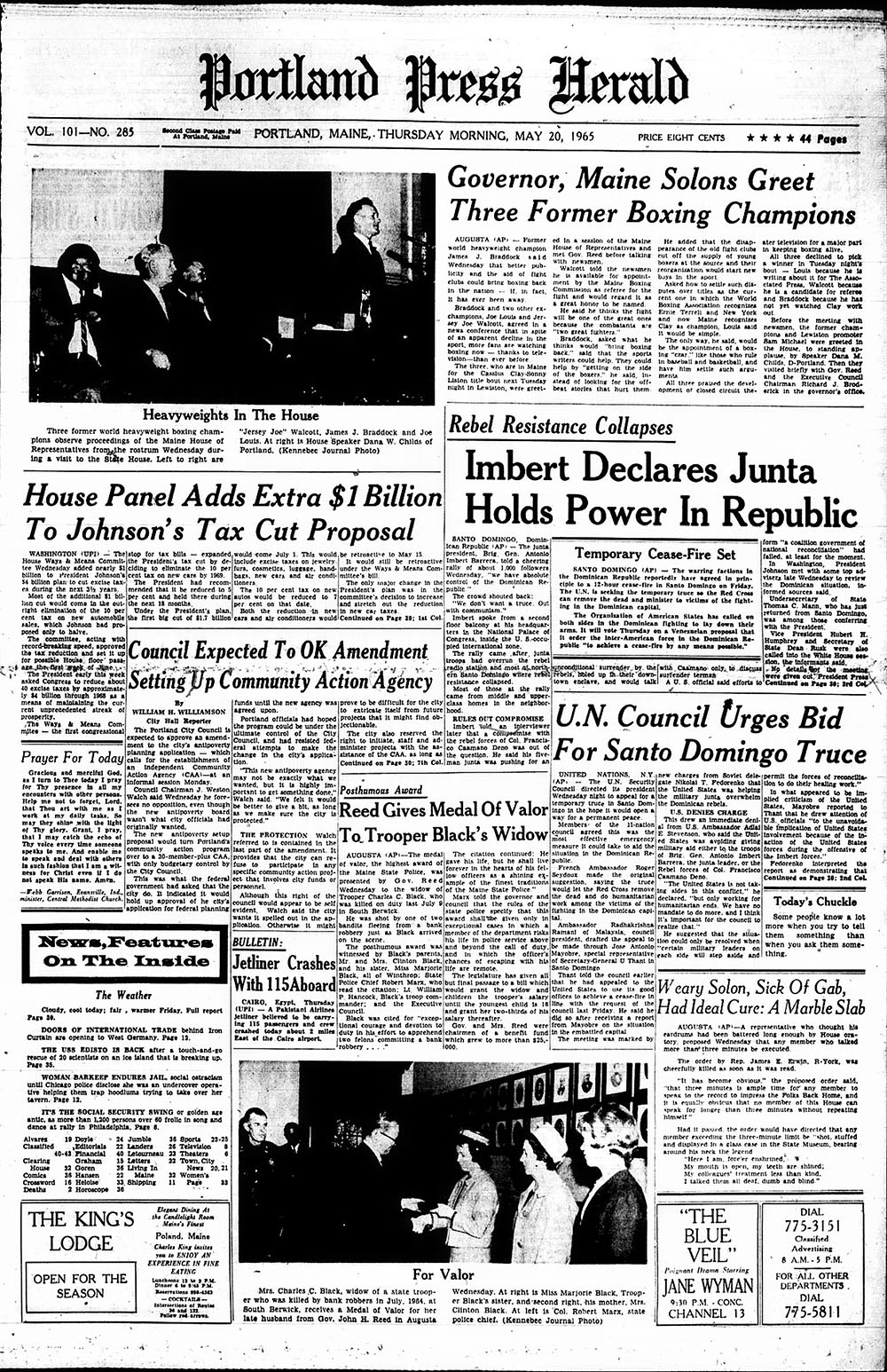 View the historic front page from the Portland Press Herald: Weary solon, sick of gab, had ideal cure: a marble slab – drastic, tongue-in-cheek attempt to limit legislators to speaking three minutes or less