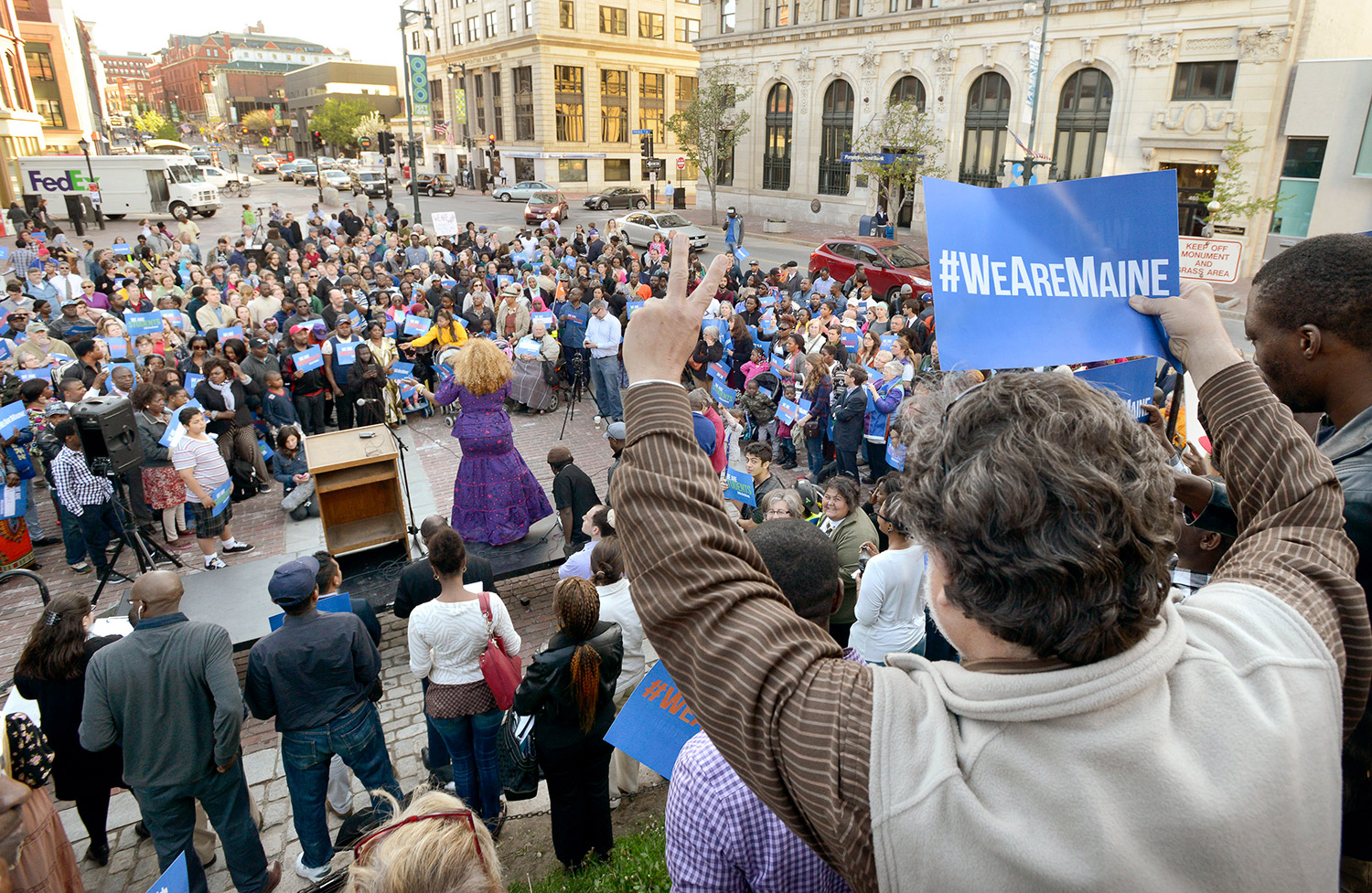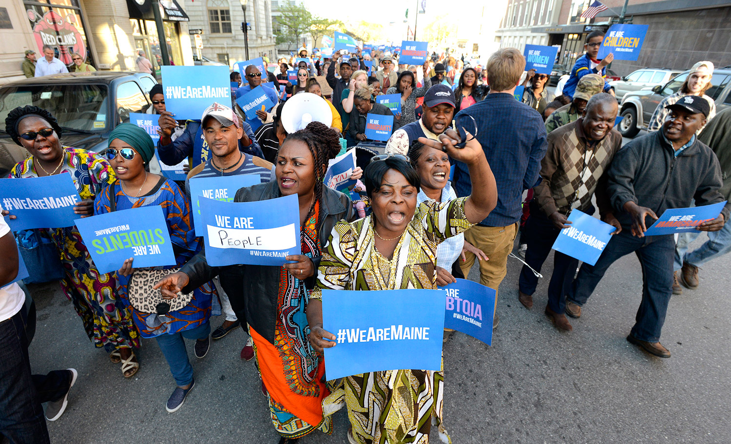 A rally organized by Maine Immigrants’ Rights Coalition is held in downtown Portland to urge lawmakers not to cut social safety net programs.
