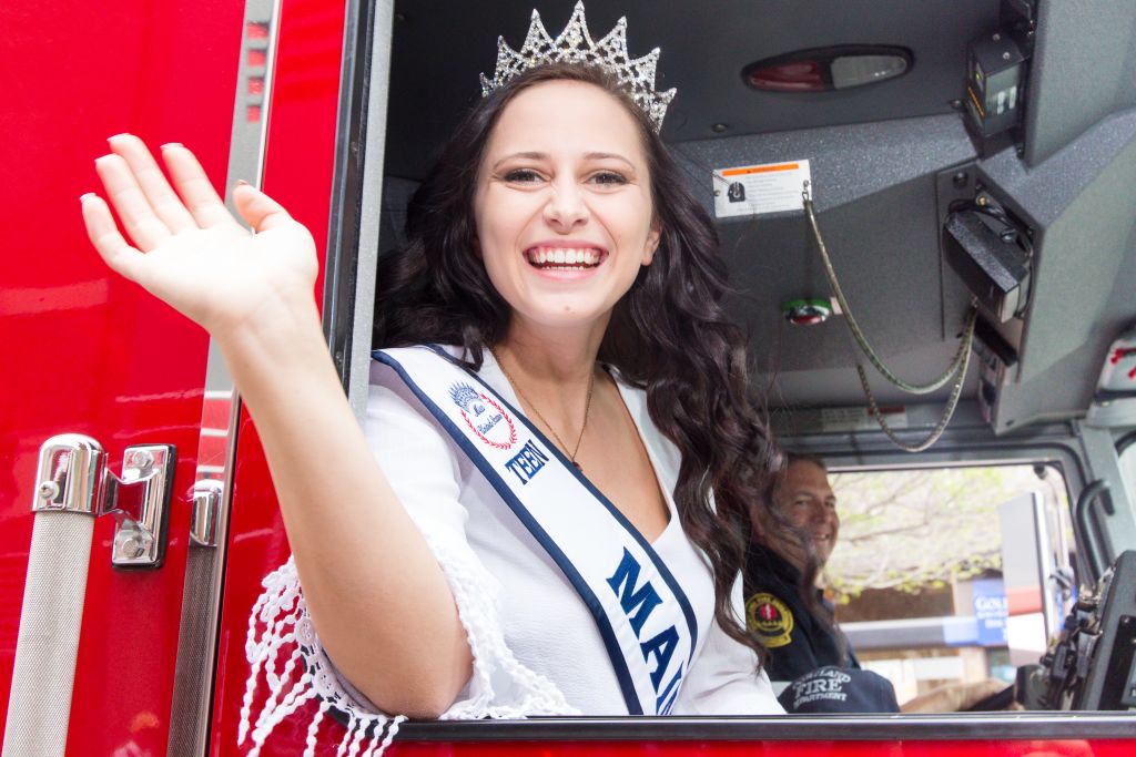 Kelley Wassick — this year’s Miss Teen Maine United States — waves from Portland Fire Engine No. 5 during the Memorial Day parade on Congress Street.