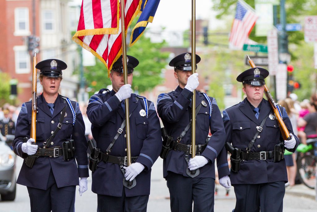 The Portland Police Honor guard marches down Congress Street at the start of Monday’s Memorial Day Parade.