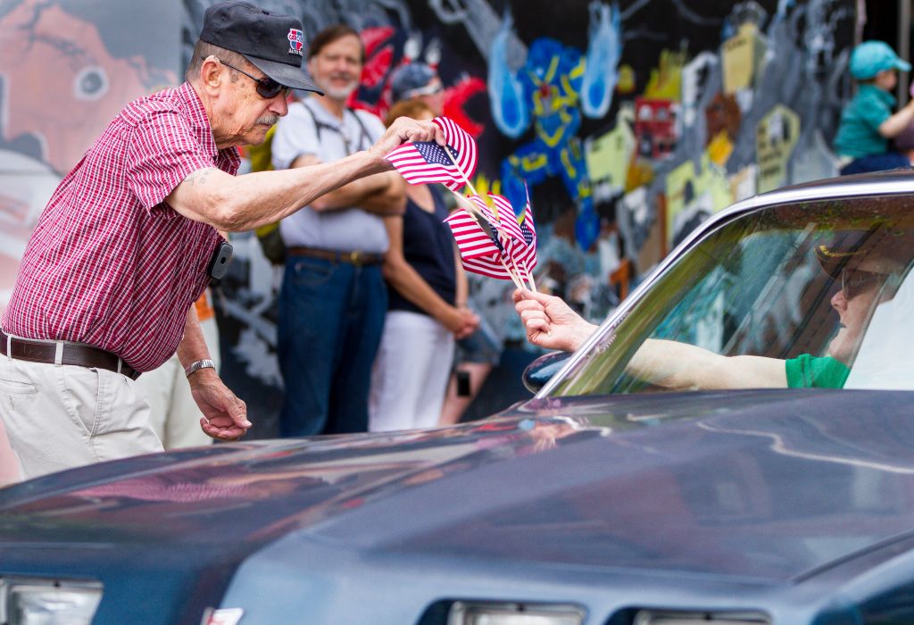 Portland resident Ken Chaney receives complimentary American flags on Congress Street courtesy of a couple of Memorial Day parade particicipants riding in a classic Pontiac Firebird.