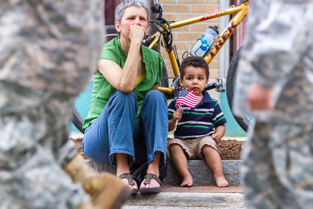 Lynn Becker and grandson Kenzo Moore watch as National Guard troops march past Monday, May 25, during the Memorial Day parade on Congress Street in Portland.