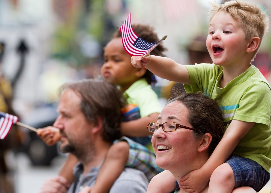 Friends Jim Craddock and Michala Williams hold their respective children — Mats Craddock and Liam Williams — during the Memorial Day parade.