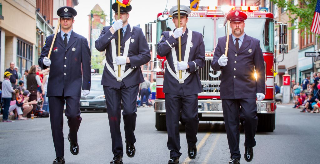The Portland Fire Department Honor Guard marches down Congress Street on Monday, May 25, during the annual Memorial Day parade in Portland.