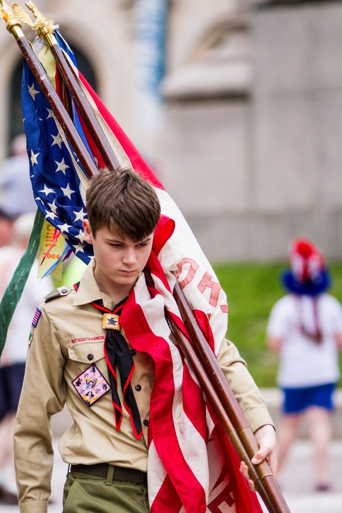 Noah Wickenheiser, of Portland’s Boy Scouts of America Troop 1, carries the troop’s flags through Monument Square at the end of the Memorial Day parade.