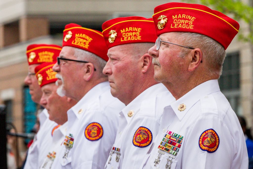 Members of the Marine Corps League stand at attention Monday during a Memorial Day ceremony at Monument Square in Portland.