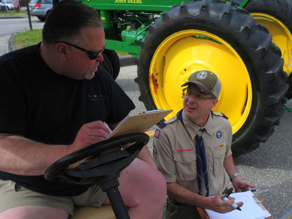 Shane McKenna, left, and Dan Eosco discuss Memorial Day parade details in Bath on Monday morning. They stepped in to help manage the event after an anonymous donor picked up most of the tab.