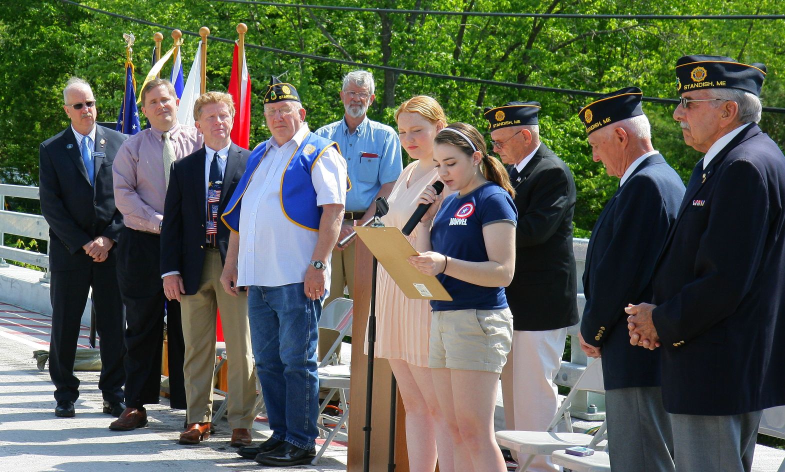 Bonny Eagle High School student Katherine Lind sings “God Bless the USA” as Rep. John Kinney, R-Limington; Rep. Mike Shaw, D-Standish; and Sen. Bill Diamond, D-Cumberland; look on. More than 60 people, including three state legislators, dedicated the new Saco River Bridge connecting Standish and Limington as the “Veterans Memorial Bridge.”Photos courtesy of Dan Kasprzyk