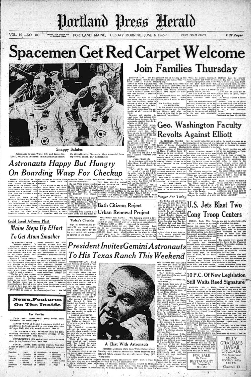 View the historic front page from the Portland Press Herald: Maine steps up effort to get atom smasher; Bath citizens reject urban renewal project; LBJ invites Gemini astronauts to ranch for weekend.