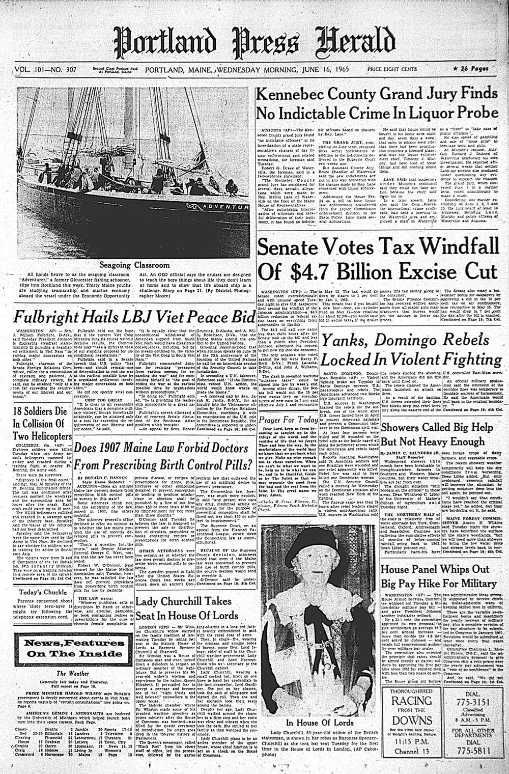 View the historic front page from the Portland Press Herald: Does 1907 Maine law forbid doctors from prescribing birth control pills?; Fulbright hails LBJ Viet peace bid
