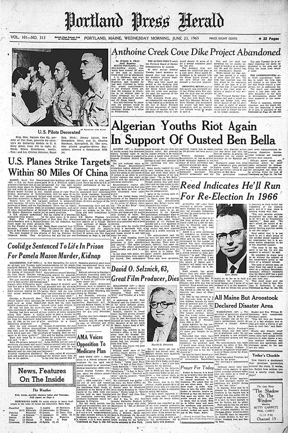 View the historic front page from the Portland Press Herald: Maine Gov. Reed indicates he’ll run for re-election in 1966; All Maine but Aroostook declared disaster area; Antoine Creek Cove dike project in South Portland abandonned