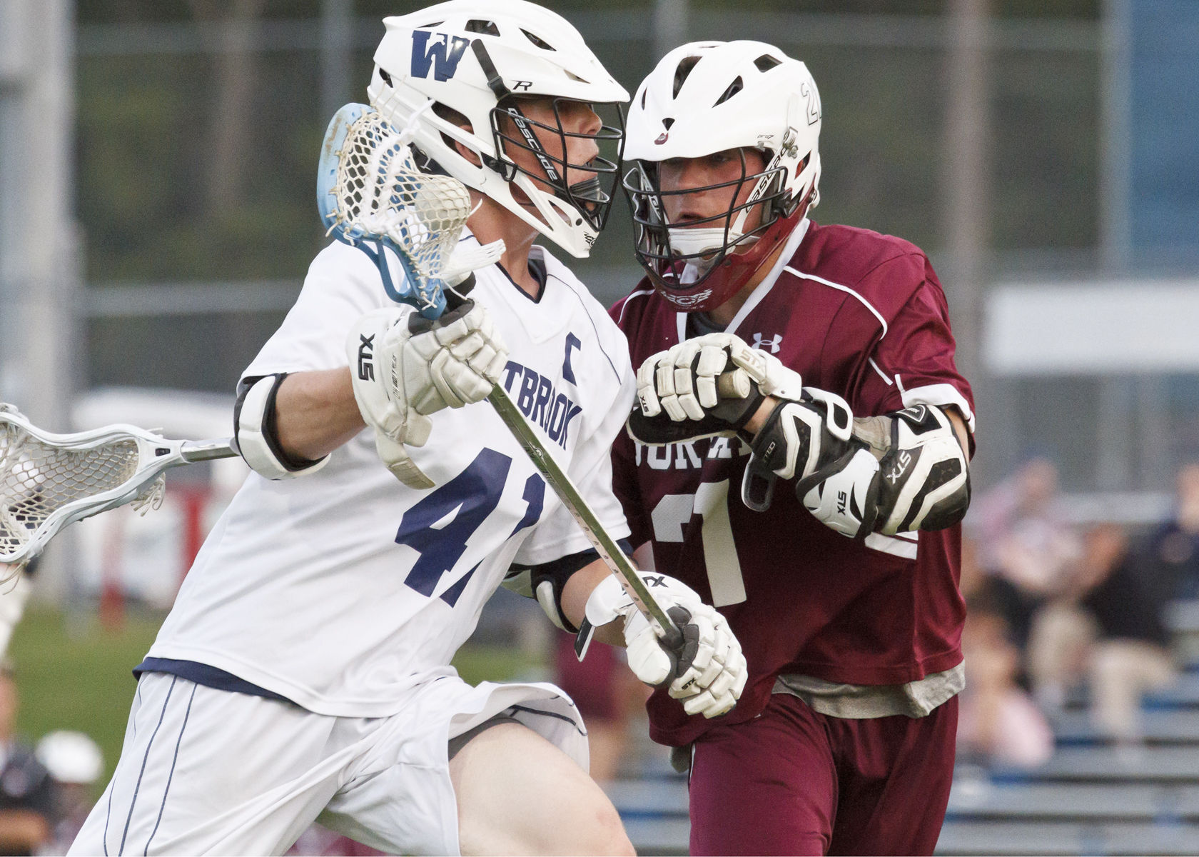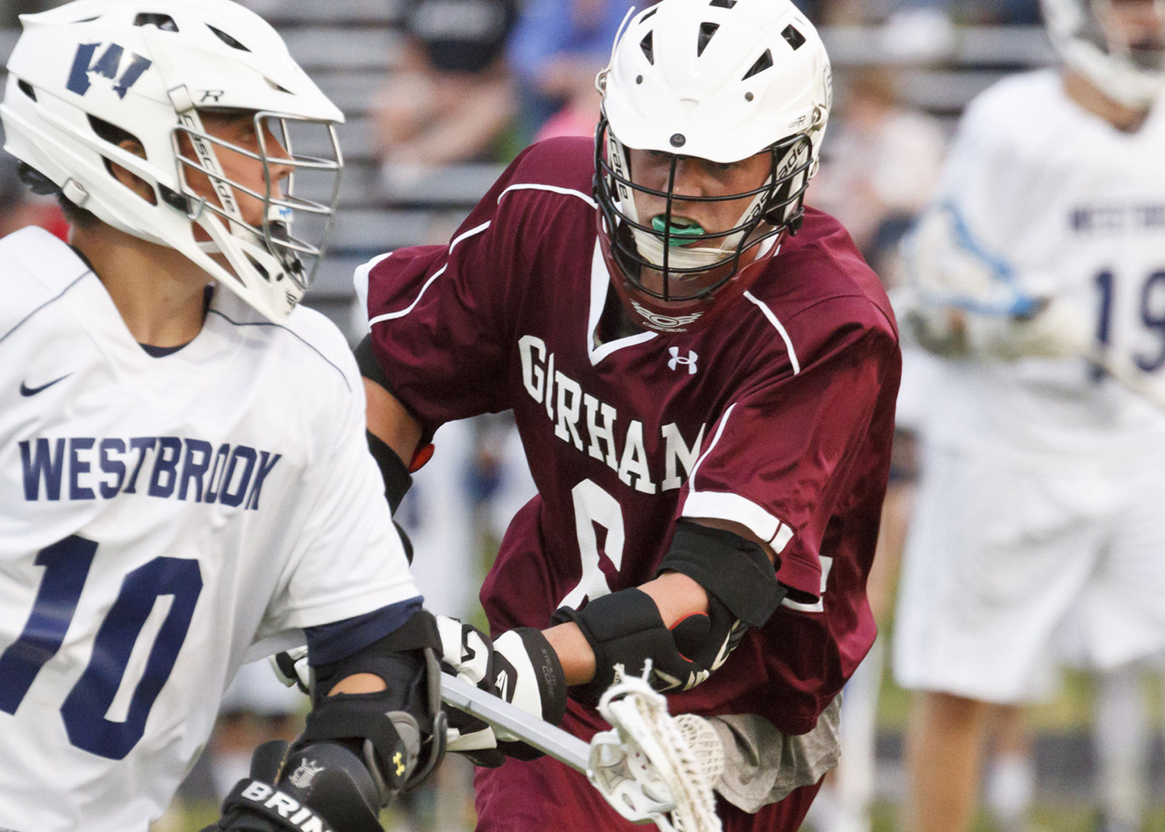 Boys lacrosse players are often told to pressure their opponents’ hands…but sometimes the chin gets in the way. South Portland’s Lucas Michaud collides with Gorham’s Alex York in the teams’ semifinal on Saturday.