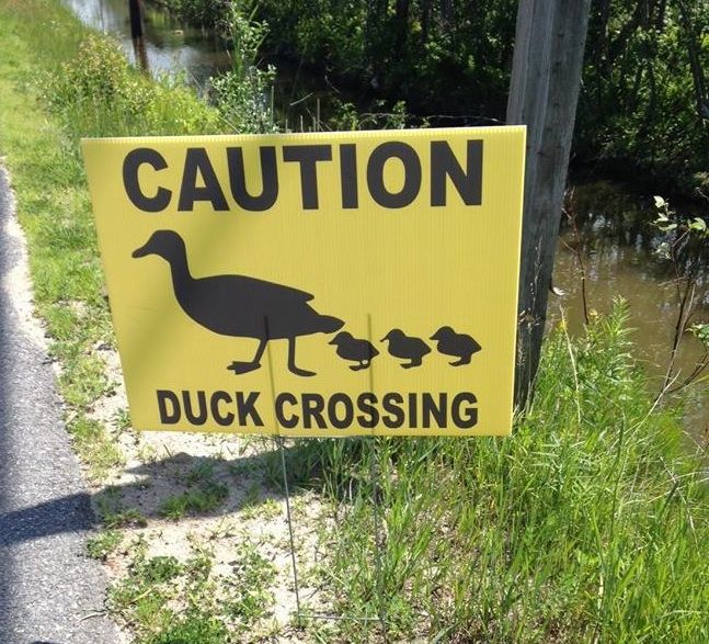 For the past several weeks, staff members at the Scarborough Public Library have spotted a family of ducklings making their way across busy Route 114. The young ducks enjoy swimming in the flooded culvert along the east side of the road, but also like to hide in the cattails and reeds on the west side. After a few near misses a bit of collaboration between the library and Public Works resulted in a new, bright yellow caution sign warning drivers to slow down.Courtesy photo