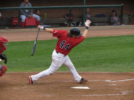 Ryan Hanigan, on rehab assignment for the Boston Red Sox, strikes out, but with grace and style.Photo by Tom Keene