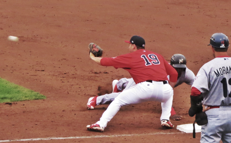 New Sea Dog first baseman Sam Travis takes a pick-off throw during Portland’s recent home stand.Photo by Tom Keene
