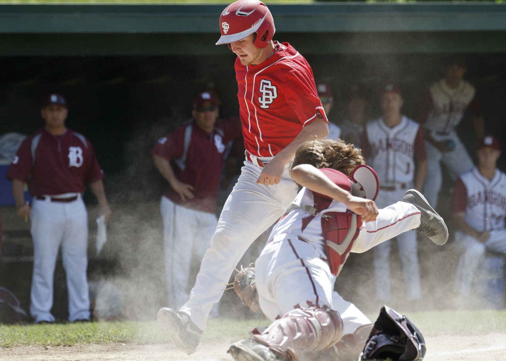 South Portland’s Matt Beecher scores the first run of the Class A Baseball State Final with Bangor.