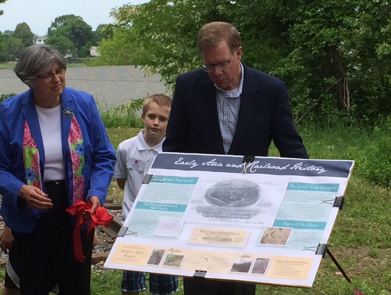 Pan Am Railways president David Fink, right, and Brown Elementary School principal Margaret Hawkins unveiled an interpretive marker that details the history of an historic railroad along the Greenbelt Walkway in South Portland recently. Courtesy photo