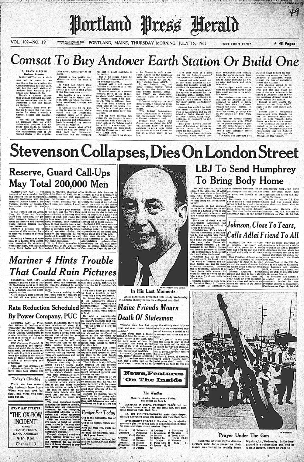 View the historic front page from the Portland Press Herald: Adlai Stevenson collapses, dies on London street; Maine electric rates to be reduced