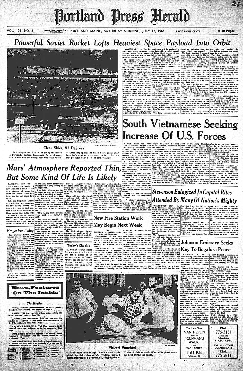 View the historic front page from the Portland Press Herald: Mars atmosphere thin, but life likely