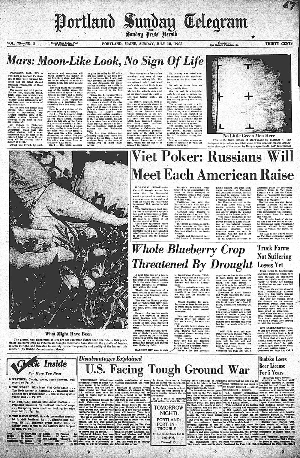 View the historic front page from the Portland Sunday Telegram: No little green men on Mars; Blueberry crop threatened by drought